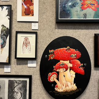 With everything building up for their big night, instead of nerves, the seniors experienced great bonding opportunities while setting up. Photos posted to social media show exactly that! Not only was this an event where the seniors could feature their amazing artwork, but it was also a place for them to feature their personalities. Some being shown in sculptures, like Rae West double sided floating angel eye, along with mushroom paintings from Sophie Alsip. This night was blooming with creativity and positivity too.